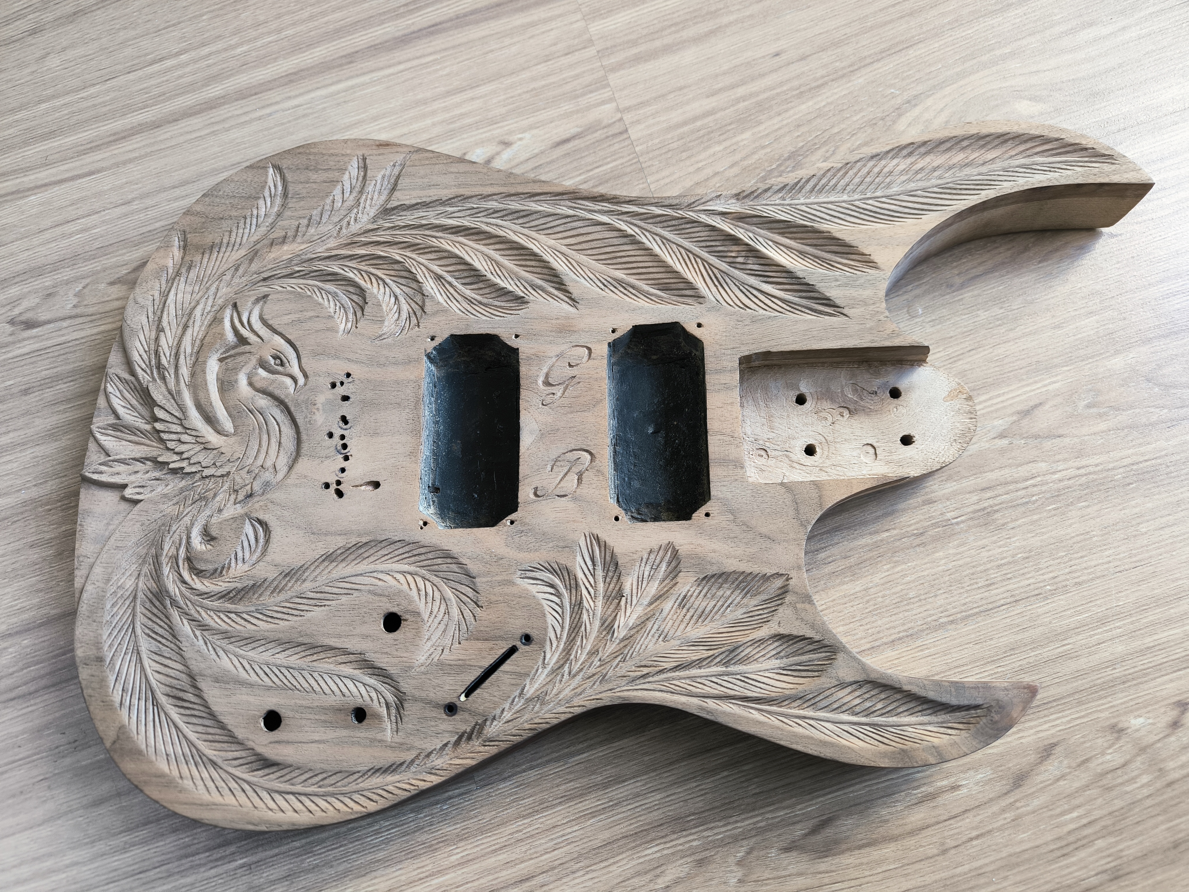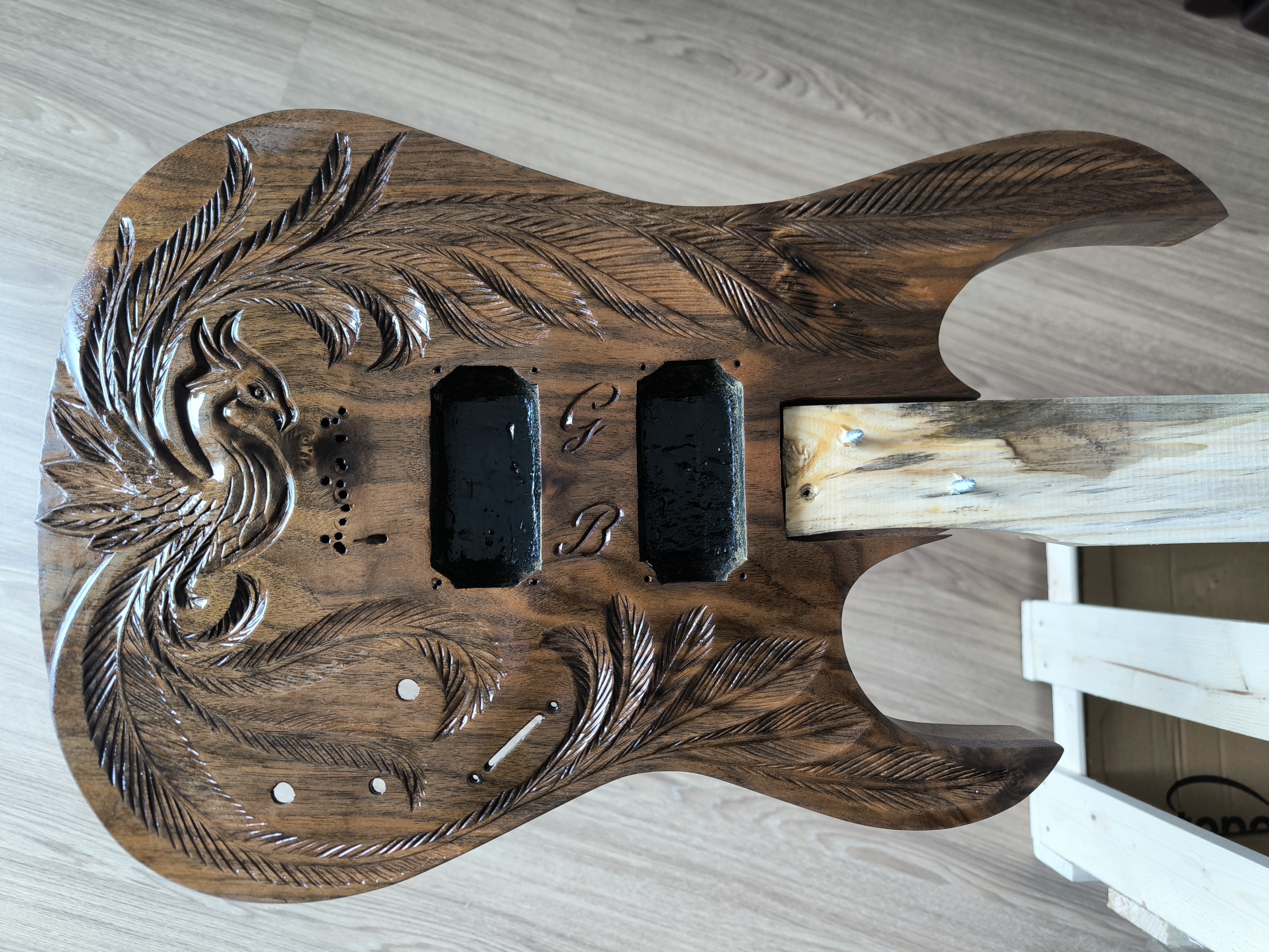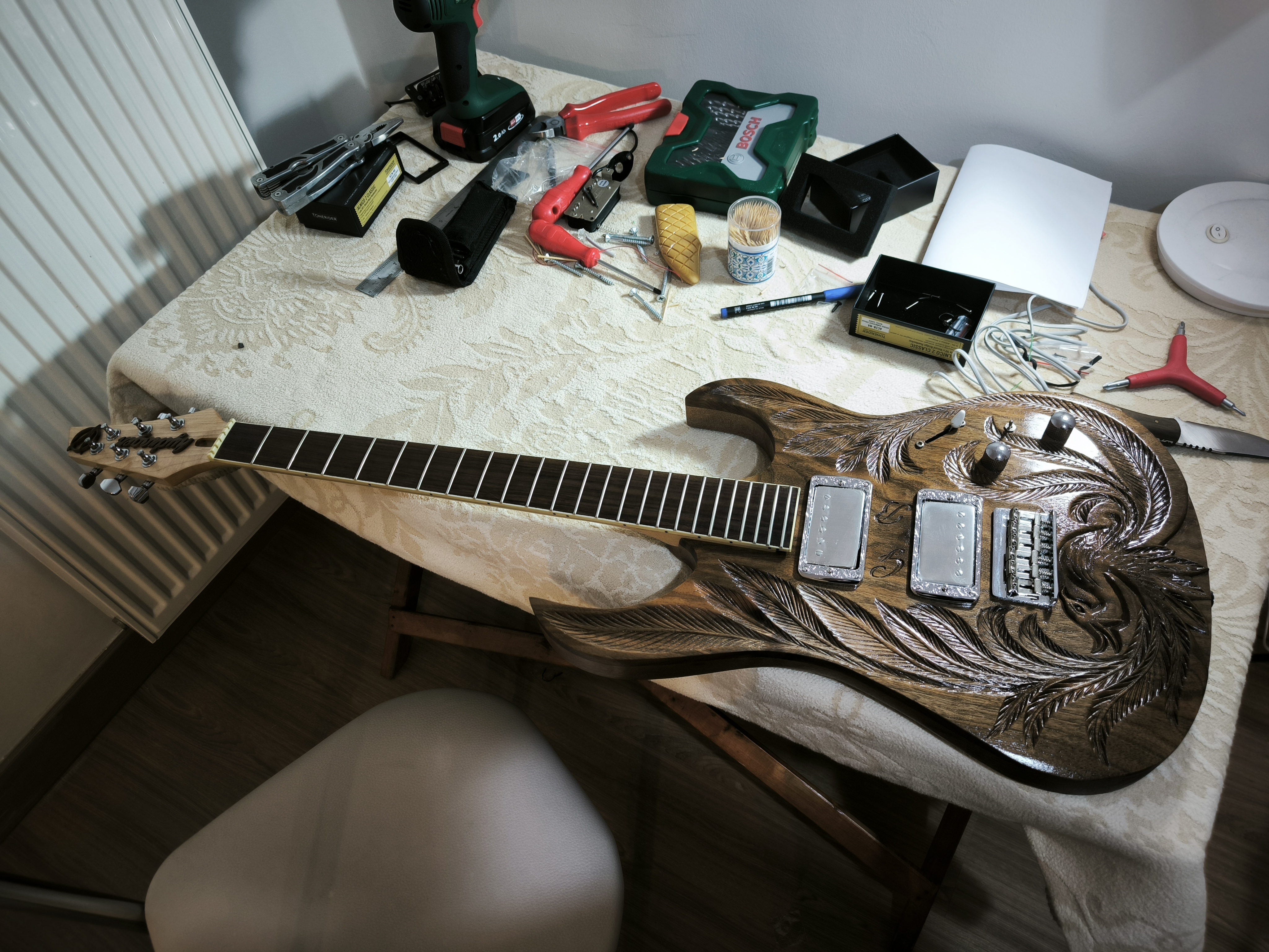 Gövde artık bir ağaç parçası değil, bir enstrüman olmaya hazırdı. Sap montajı, köprü ayarı ve elektroniklerin (manyetiklerin) oymalı gövdeye yerleştirilmesi aşamasına geçtim.