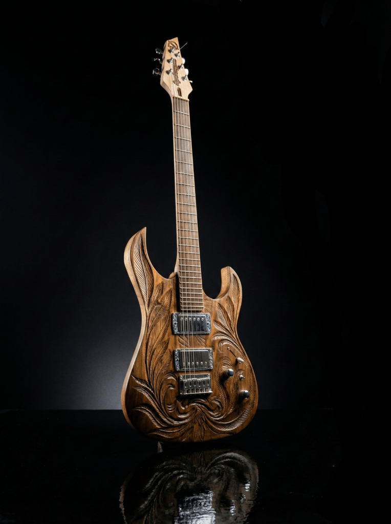 Sonuç? Ceviz ağacının o hırçın ama net karakteri yerli yerinde duruyordu. Hatta oymaların yarattığı yüzey alanı değişimi, gitara sanki daha akustik, daha “hava alan” bir rezonans katmıştı. Hem görsel olarak sahnede “ben buradayım” diyen, hem de tonuyla bunu destekleyen bir canavar ortaya çıktı.